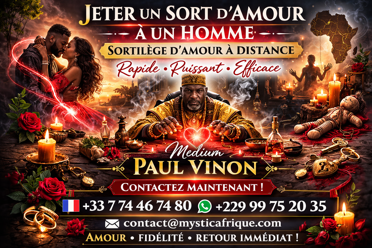 Appelez dès maintenant Medium Paul Vinon pour discuter de votre situation et recevoir un rituel sur-mesure : +33 7 74 46 74 80 / +229 99 75 20 35 ou envoyez un email : contact@mysticafrique.com.