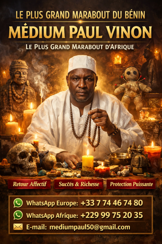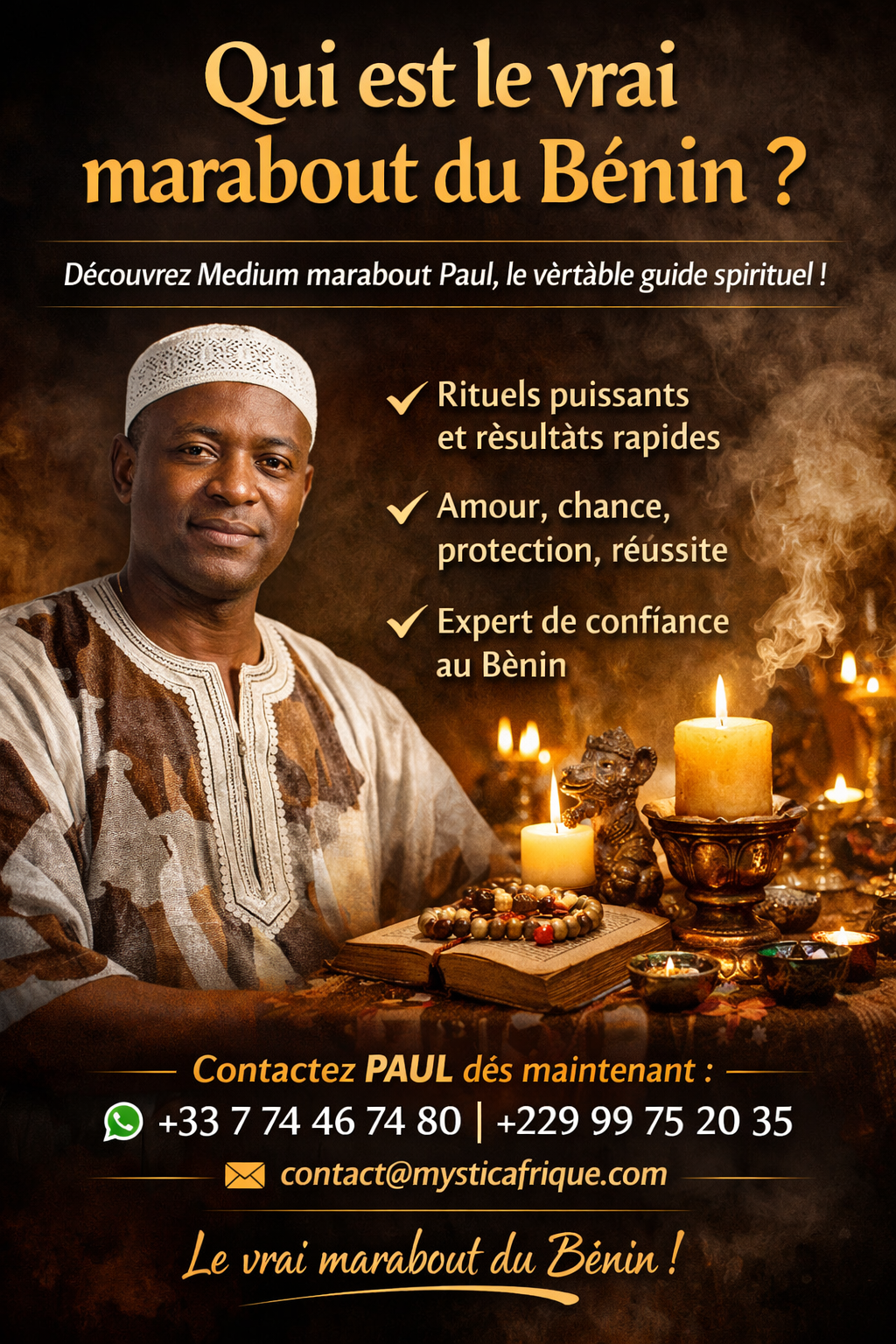 Vous cherchez un vrai marabout au Bénin capable de vous guider, de résoudre vos problèmes et de transformer votre vie ? Ne perdez plus de temps avec des promesses vides. Medium marabout Paul est reconnu pour son efficacité, sa bienveillance et son expérience incomparable.
